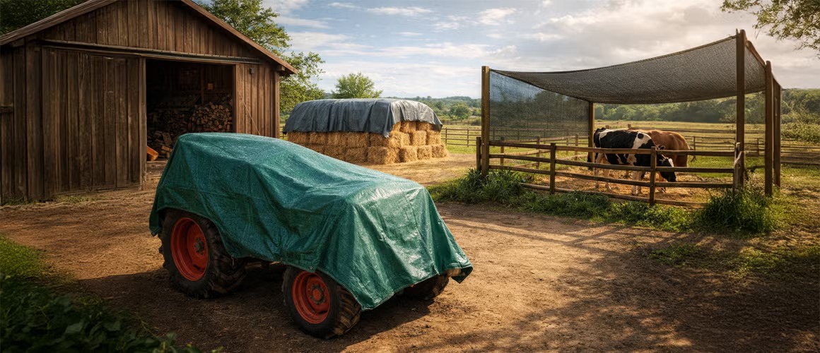UV‑stabilized industrial tarpaulin for warehousing, open storage yards, and protecting bulk goods from sun, rain, and dust.
